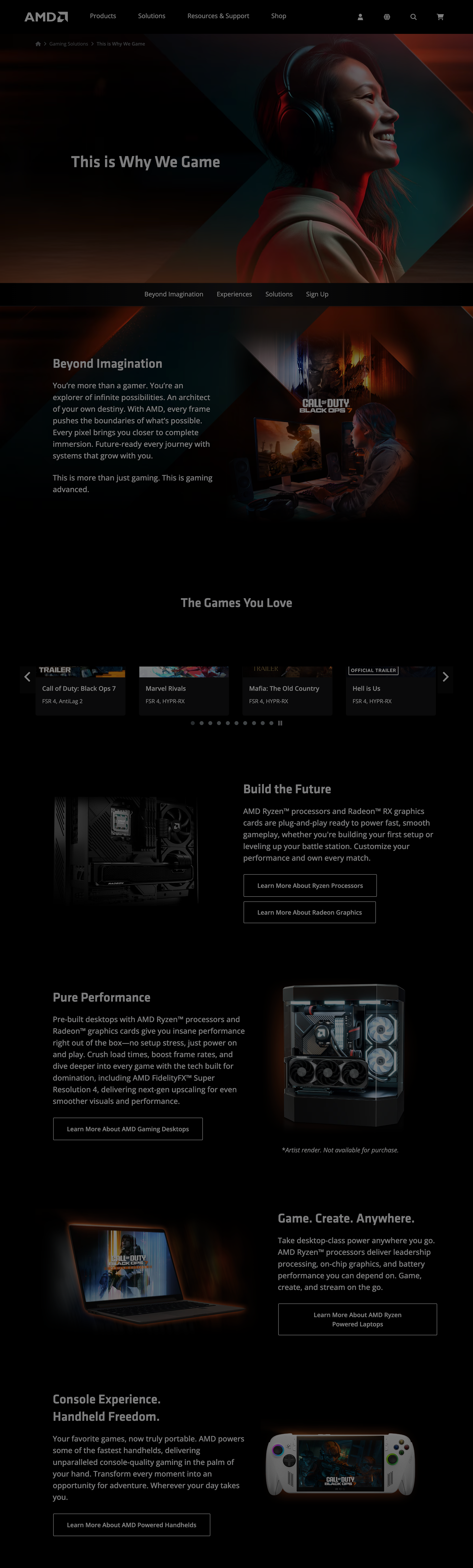 As part of my work at AMD, I led the refresh of the “Gamers First” campaign, building on the momentum of the original multichannel creative platform to re-energize our connection with the gaming community. We took the foundational idea of “gear up for gaming” and elevated it with richer visuals, sharper storytelling, and new technology cues. From full-system rigs to handhelds, the campaign reinforces that when you game on an AMD Ryzen™ + Radeon™ platform, you’re first in line to perform, to immerse, to win. Drawing from messaging like “equipped for every moment” and “make your performance legendary,” we crafted content that spans hero video, social snippets, out-of-home, and interactive formats.